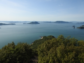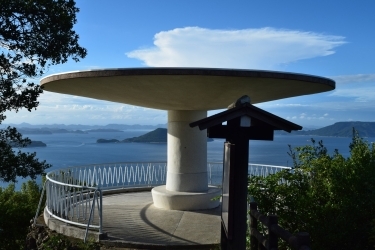 ウバメガシ林の階段を降りると、そこに「遊鶴亭」があります。南嶺駐車場から北嶺の「遊鶴亭」までは、片道おおよそ2.3㎞と少し距離はありますが、そこからはぐるっと300度ほどの景色をパノラマで見渡すことができ、屋島の最北端「長崎の鼻」をはじめ、瀬戸内海の島々を一望できる絶景スポットとなっています。