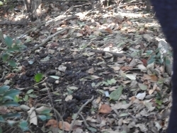 ありました。タヌキの溜めフン場です。この場所で、タヌキ同士が情報交換を行っていると考えられています。ちらっと見ただけで、柿、銀杏、アケビの種が含まれていて、タヌキの食生活がわかります。