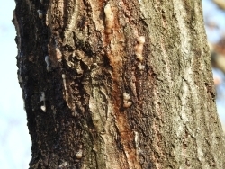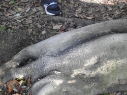 木の根が板状になっているところを板根といいます。この白くなった板根は、イノシシが体をスリスリした跡。近くのぬた場で水浴びしたあとにここへきて体をこすりつけているのです。よく見ると、森の中には動物たちの残した跡がたくさん見られるのですね。