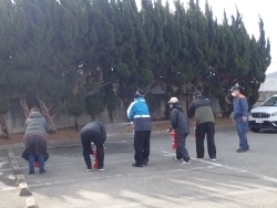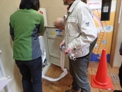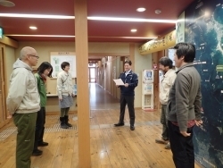 展示スペースから出火したとの想定で、五色台ビジターセンターの職員を含む7名が参加しました。出火確認後、消防への電話連絡、来館者および職員の駐車場への避難誘導、消火班の初期消火(模擬動作確認)ののち、消火は不可能と判断し消火班が避難したことを確認するまでの一連の流れの訓練を行いました。