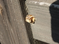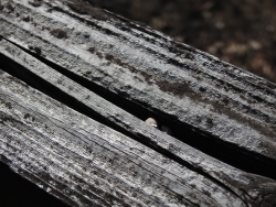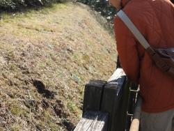 野鳥のフンがありました。よく見ると昆虫のかけらが入っています。食物の種らしきものも発見しました。野鳥のフンは、植物の種子を散布する大事な役目を担っています。途中で、野鳥の食べ跡やヤマガラの貯食と見られるものも見つかりました。法面にはノウサギのフンが多数あり、イノシシの掘った跡もみられます。木道脇では多くの野生動物が生活していることがわかりました。