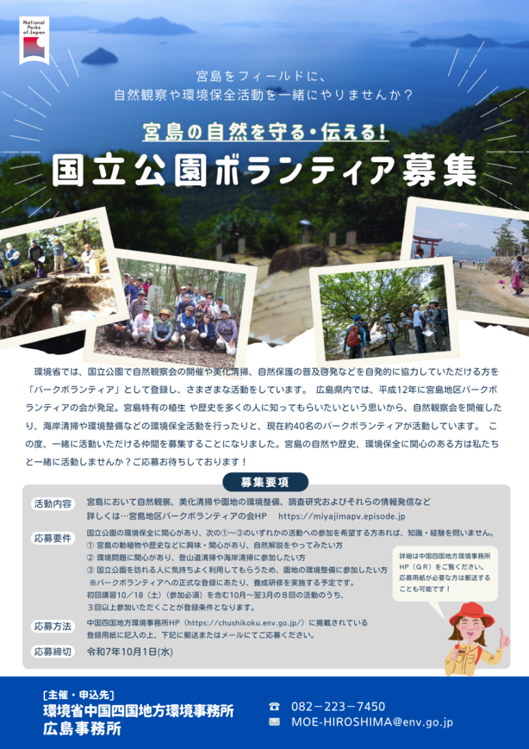 この度、一緒に活動いただける仲間を募集することになりました。宮島の自然や歴史、環境保全に興味・関心があり、国立公園を訪れる人々にその良さを伝えたいという意思をお持ちの方は、私たちと一緒に活動しませんか?ご応募お待ちしています。