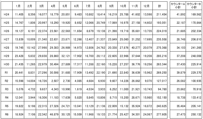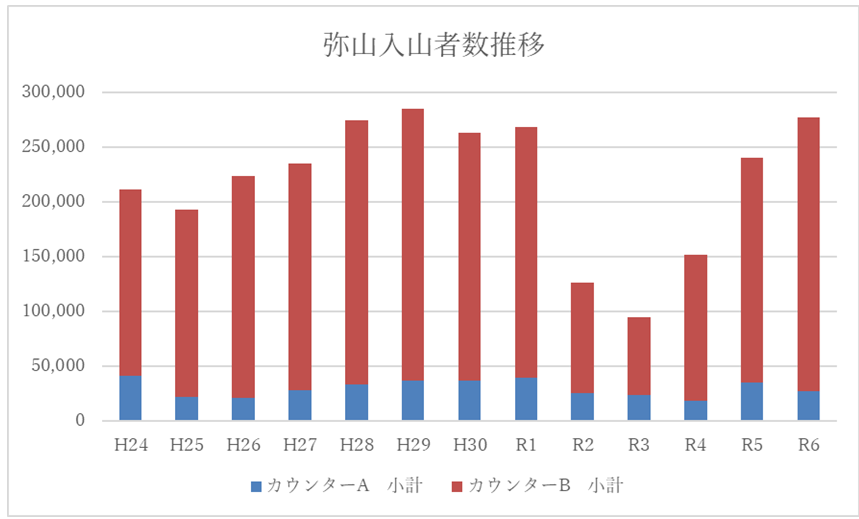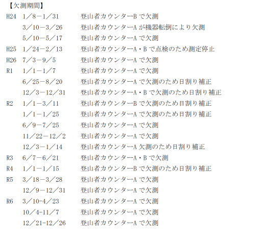 なお、登山者数は登山者カウンターA及びBの入山者数の合計値です。また、この結果は登山者カウンターの計測値であり、複数の登山者による同時通過や平行通過、センサー部分より背の低い子どもはカウントされませんので、実際の登山者数とは異なります。