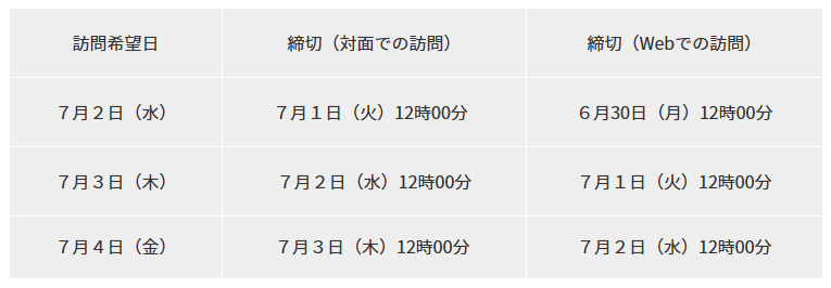 予約受付期間:令和7年6月25日(水)10時00分 ~ 訪問希望日の前日の12時00分まで(Webによる訪問については前々日の12時00分まで)