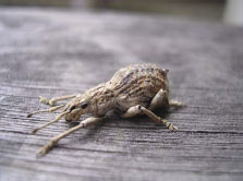 じっくり観察しようとさわって見ると、足をあげて動かなくなってしまいました。ゾウムシの仲間は、危険を察知すると身をかためて地上に落ちる習性があるためで、約3分もの間、ピクリとも動きませんでした。