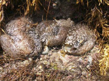 潮がよくひいた日に、ヒジキの間にアメフラシを発見しました。よくよく見ると、なんと3匹が寄り添っていました。