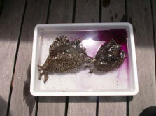 2匹をつかまえ、皆さんに観察していただきました。中には、アメフラシを初めて知った方もいて、さわった感触や赤紫色の汁に驚いていました。(観察した後は、元の場所へ戻しました)